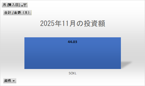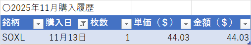 私は今月も、いつもどおり淡々と積立を継続、と行きたいところですが、ドルが枯渇してしまいました。今月は、SOXLに合計44ドルを追加投資しました。