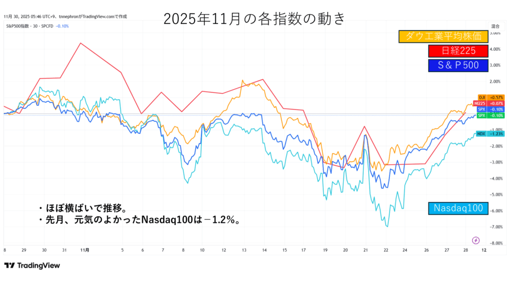 結果的に、11月のS&P500、ナスダック共に前月比で横ばい、年末ラリーへの期待をつなぐ形となりました。