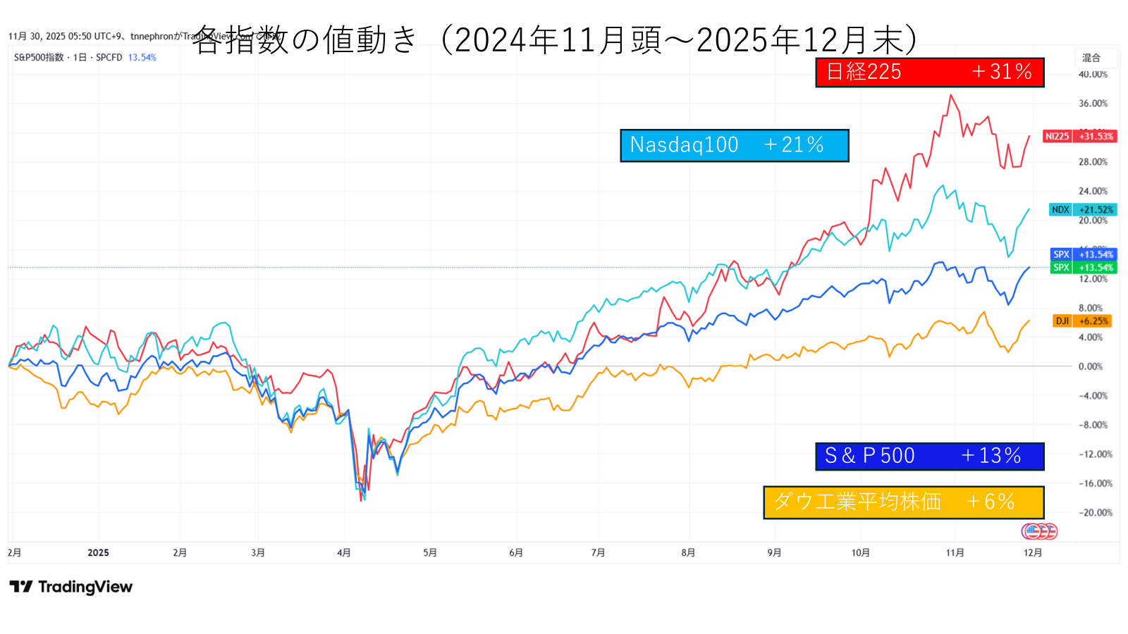 さて、11月の米国市場は、年末に向けて期待が高まる1ヶ月となりました。 10月のジェットコースター相場から一転、今月は比較的落ち着いた値動きの中で、じじりと下値を切り上げていく展開。 ブラックフライデーの消費動向や、FRBの次の一手に対する思惑が交錯しましたが、大きな崩れはなく、底堅さを感じる相場つきでした。