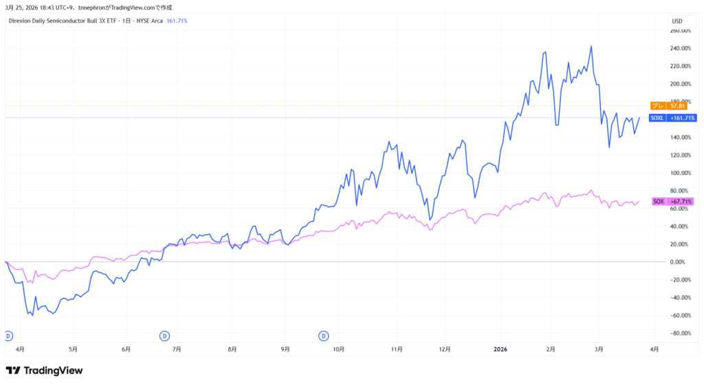 • 半導体指数が1%上がれば、SOXLは3%上がる。