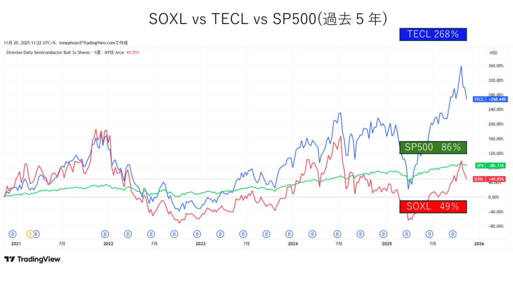 5年チャートではTECLの圧勝です。SOXLはSP500をも下回る成績ですね。
