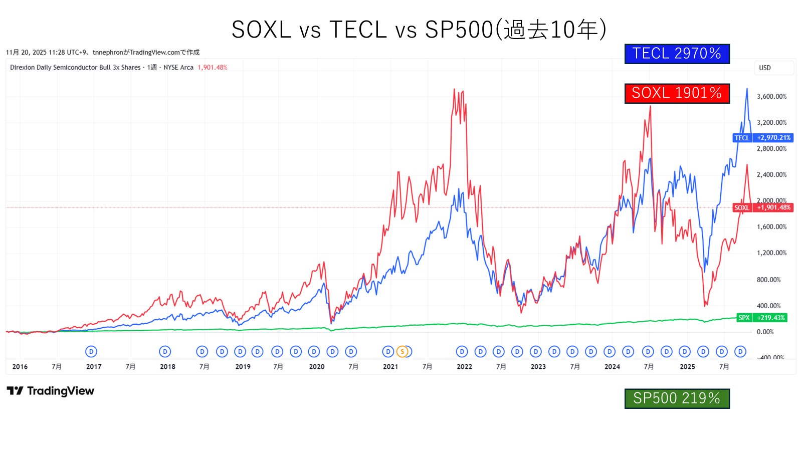 過去10年ではSOXLが強い時期も相当あるようです。切り取る時期によって優劣が変わる感じでしょうか。それにしてもTECLは過去10年で30倍ですかぁ。夢がありますね。